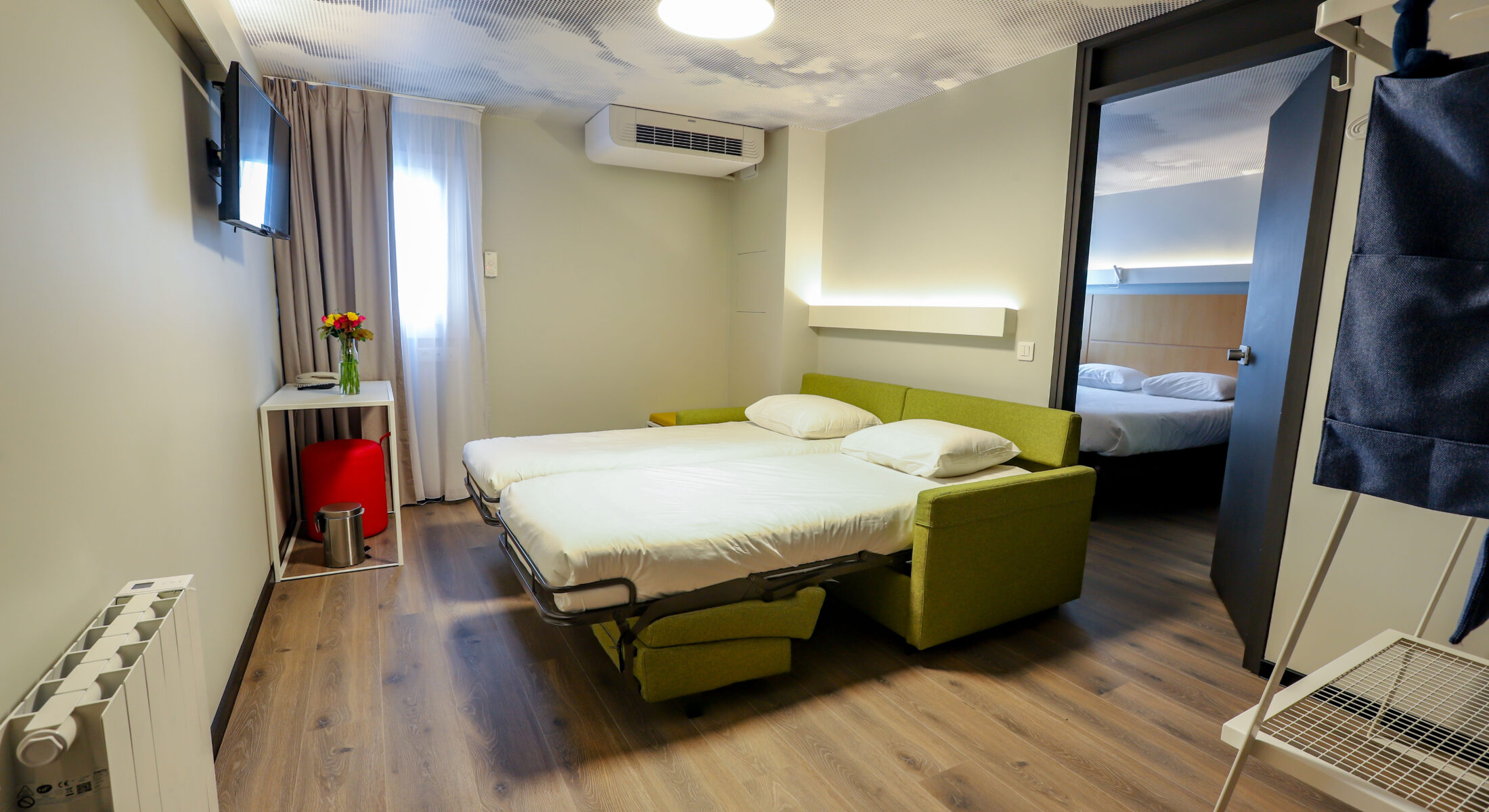 Pour une escapade en famille, découvrez notre chambre spacieuse avec un lit double confortable et deux lits simples pour un sommeil paisible.
